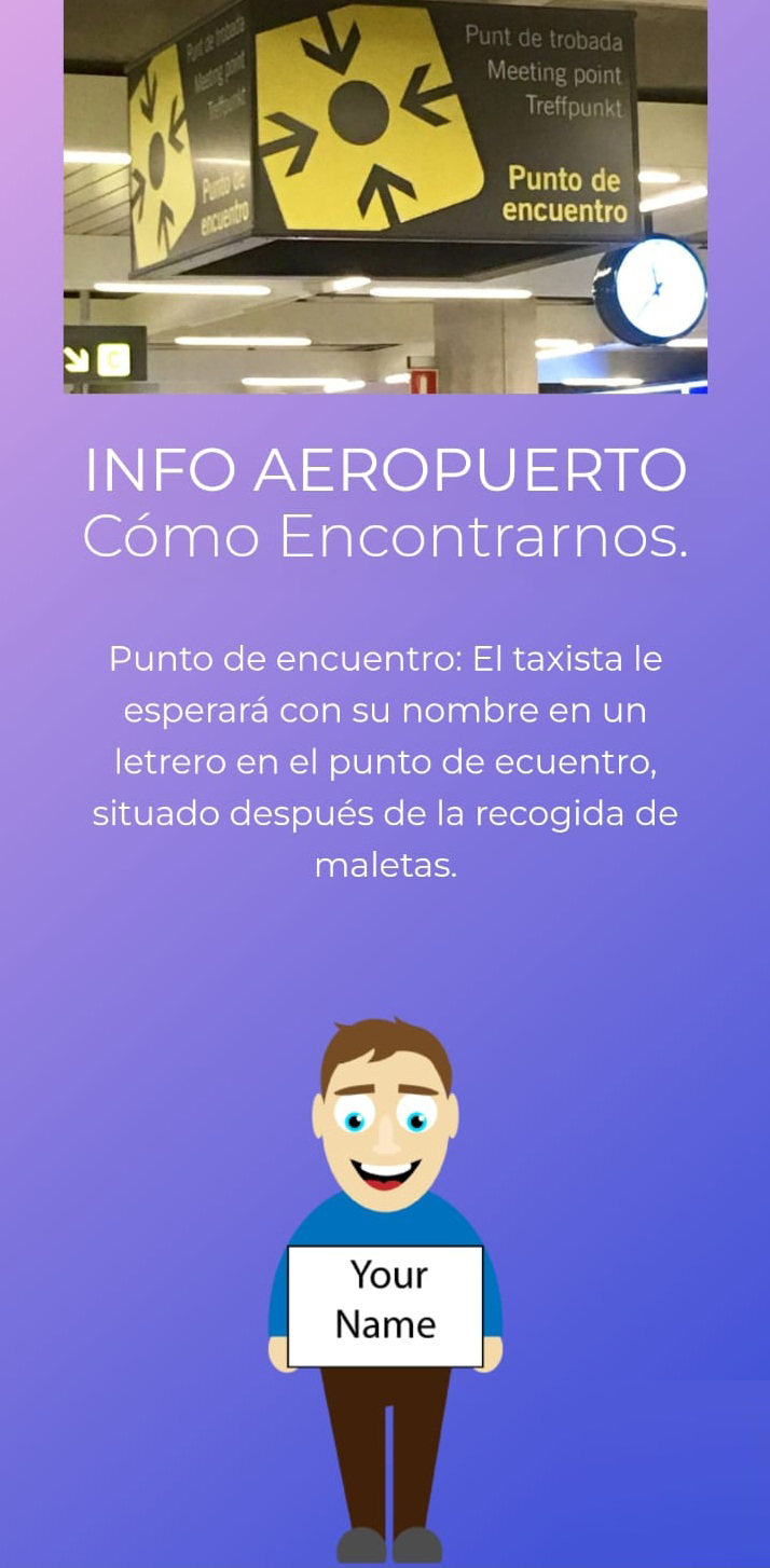 Los principales viajes, los viajes al aeropuerto, tanto sean reservados como al momento, también se puede reservar la recogida en aeropuerto, donde le estaremos esperando en punto de encuentro. El conductor le estará esperando con un cartel con su nombre.